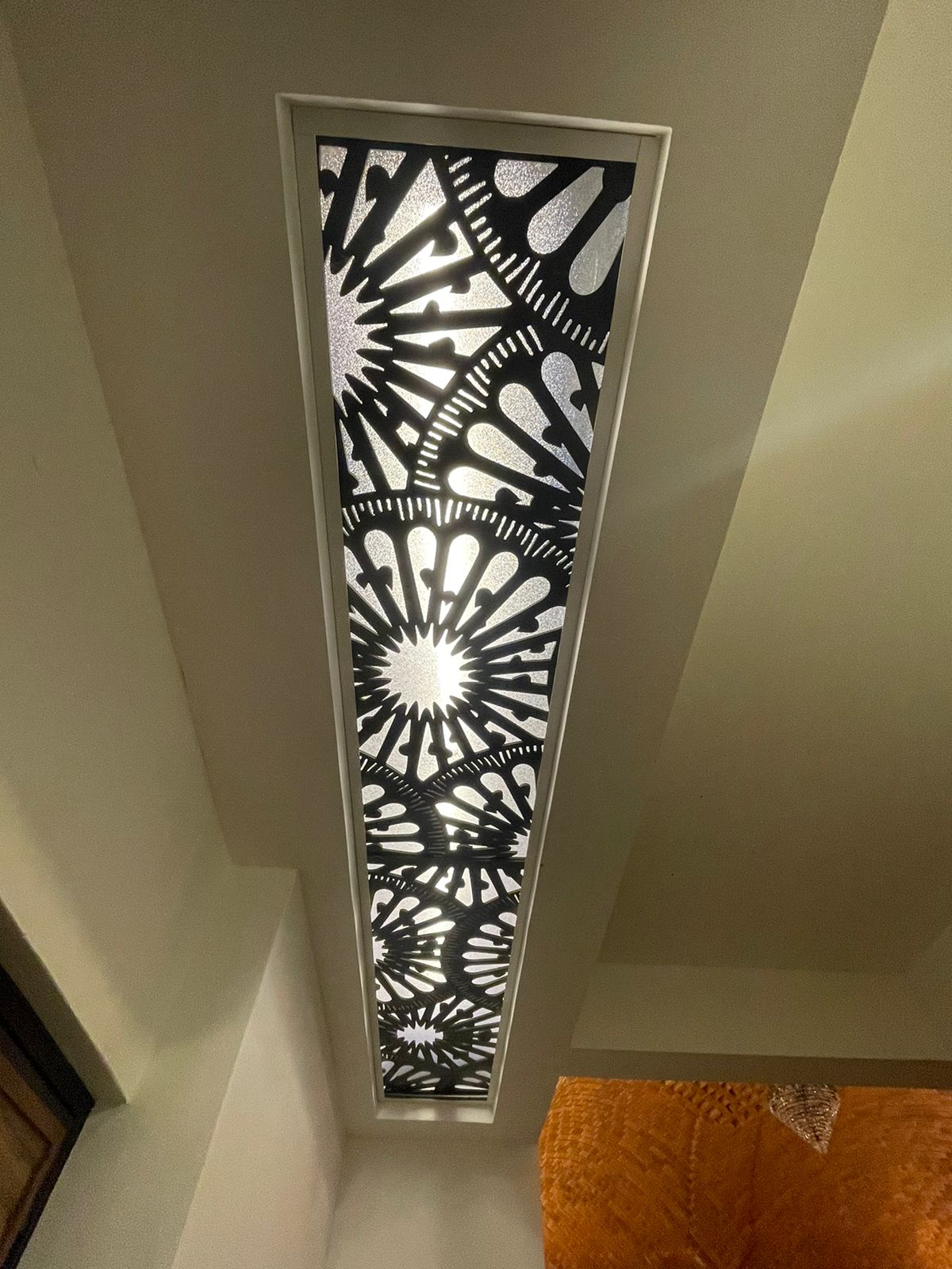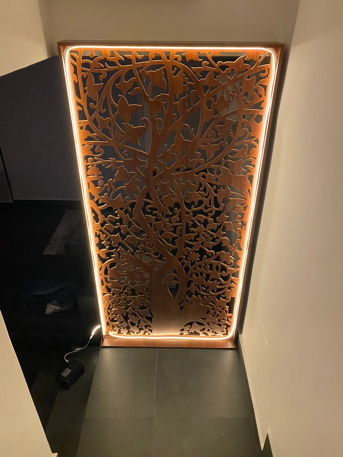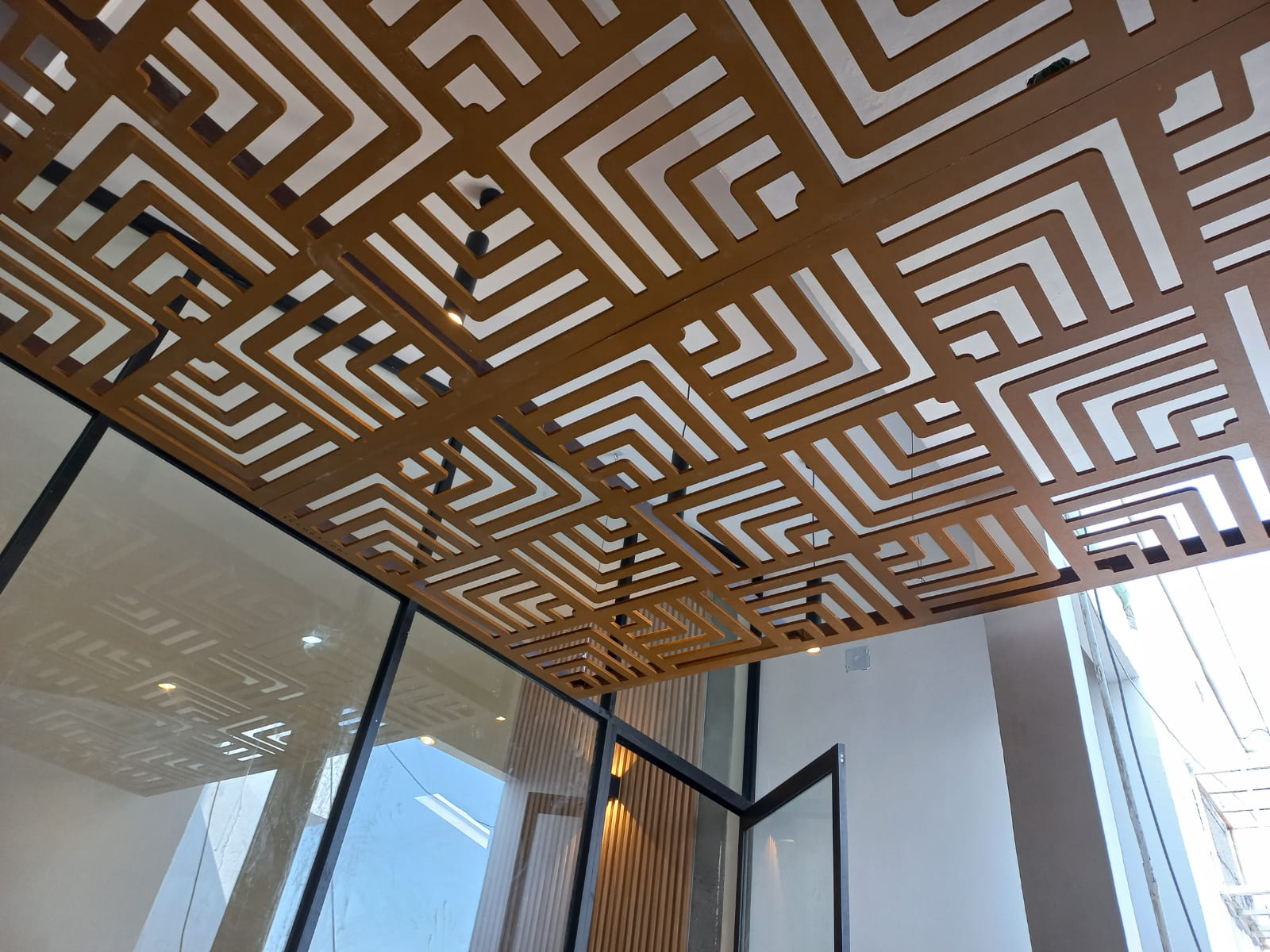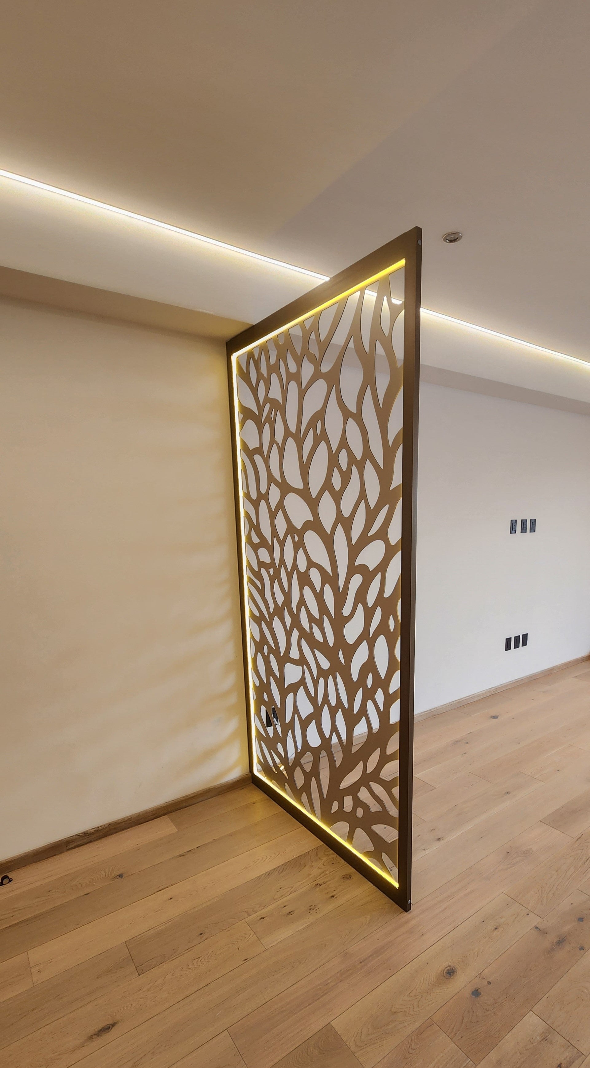 Celosía fabricada en aluminio compuesto color champagne, con marco de aluminio y luz led cálida.