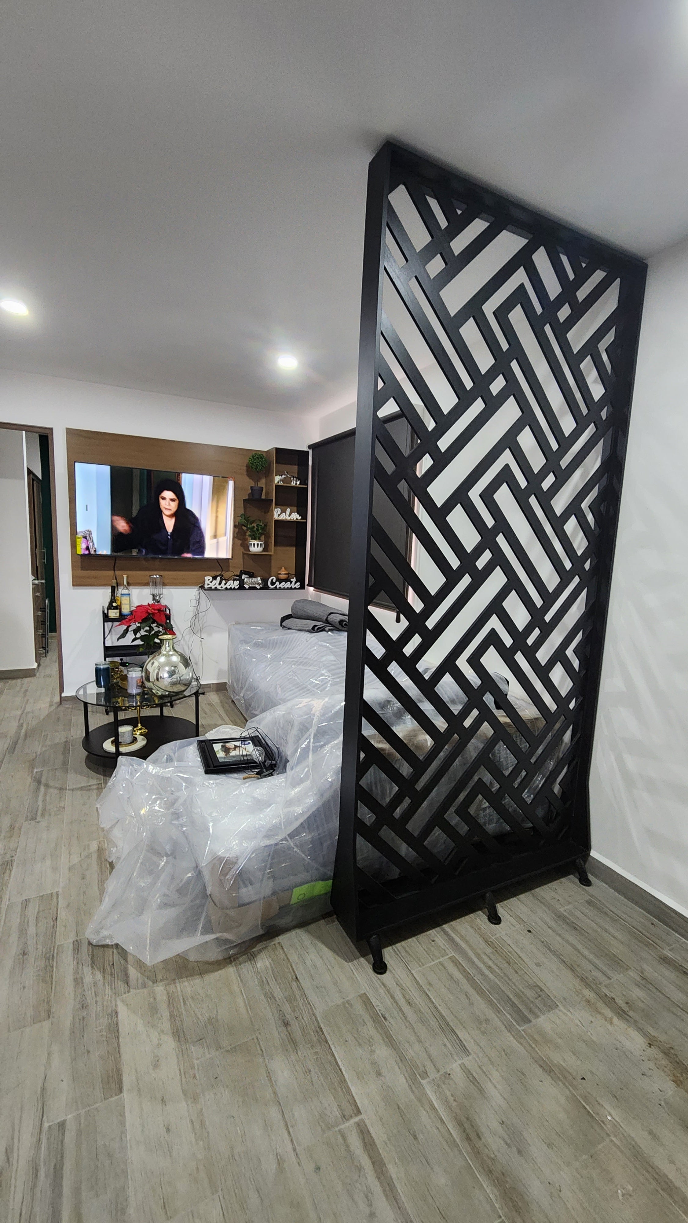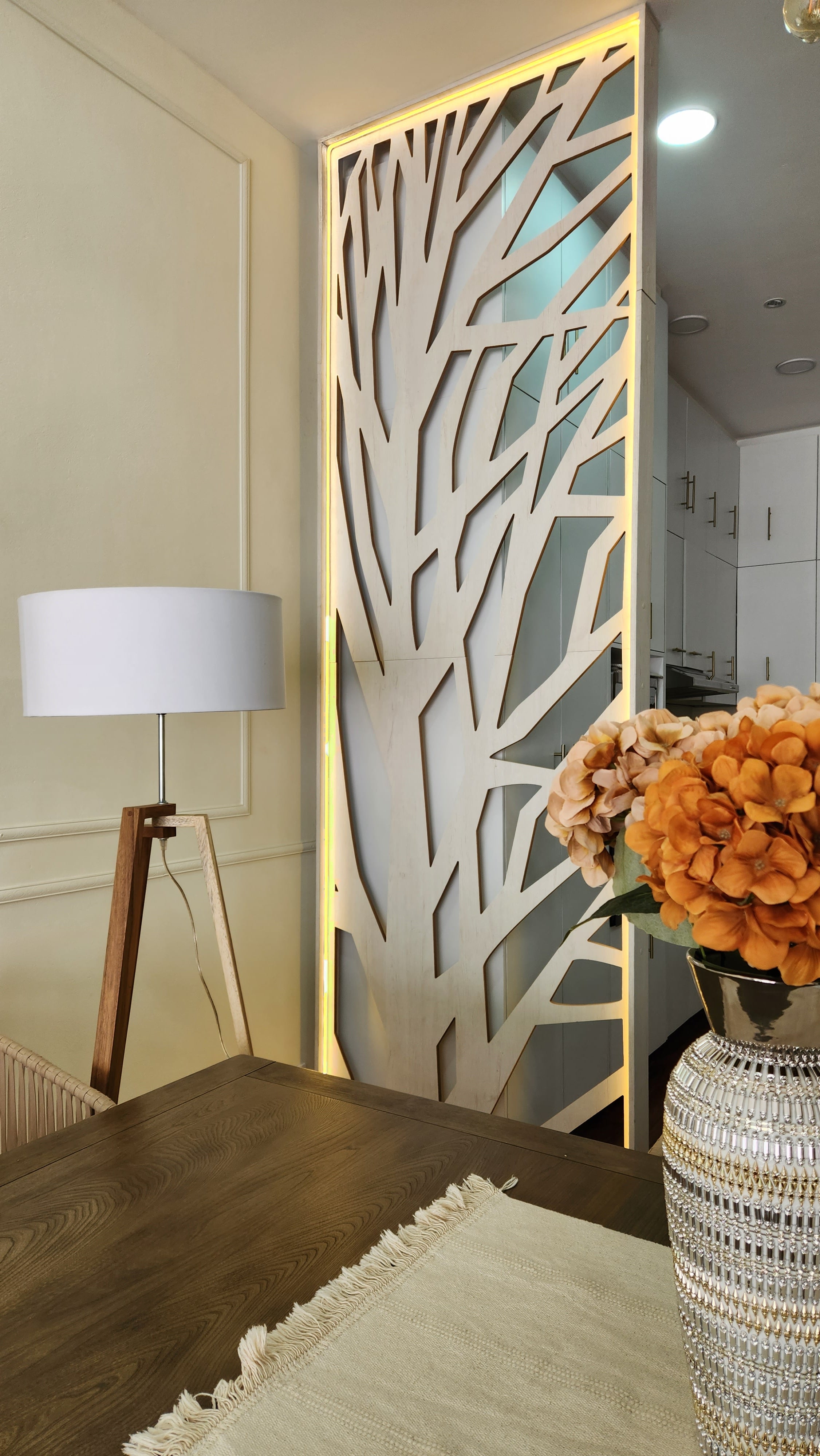 Celosía fabricada en melamina Fresno Invierno de 15 mm al igual que su marco, con iluminacíon led cálida. Instalada con taquetes y tornillos.