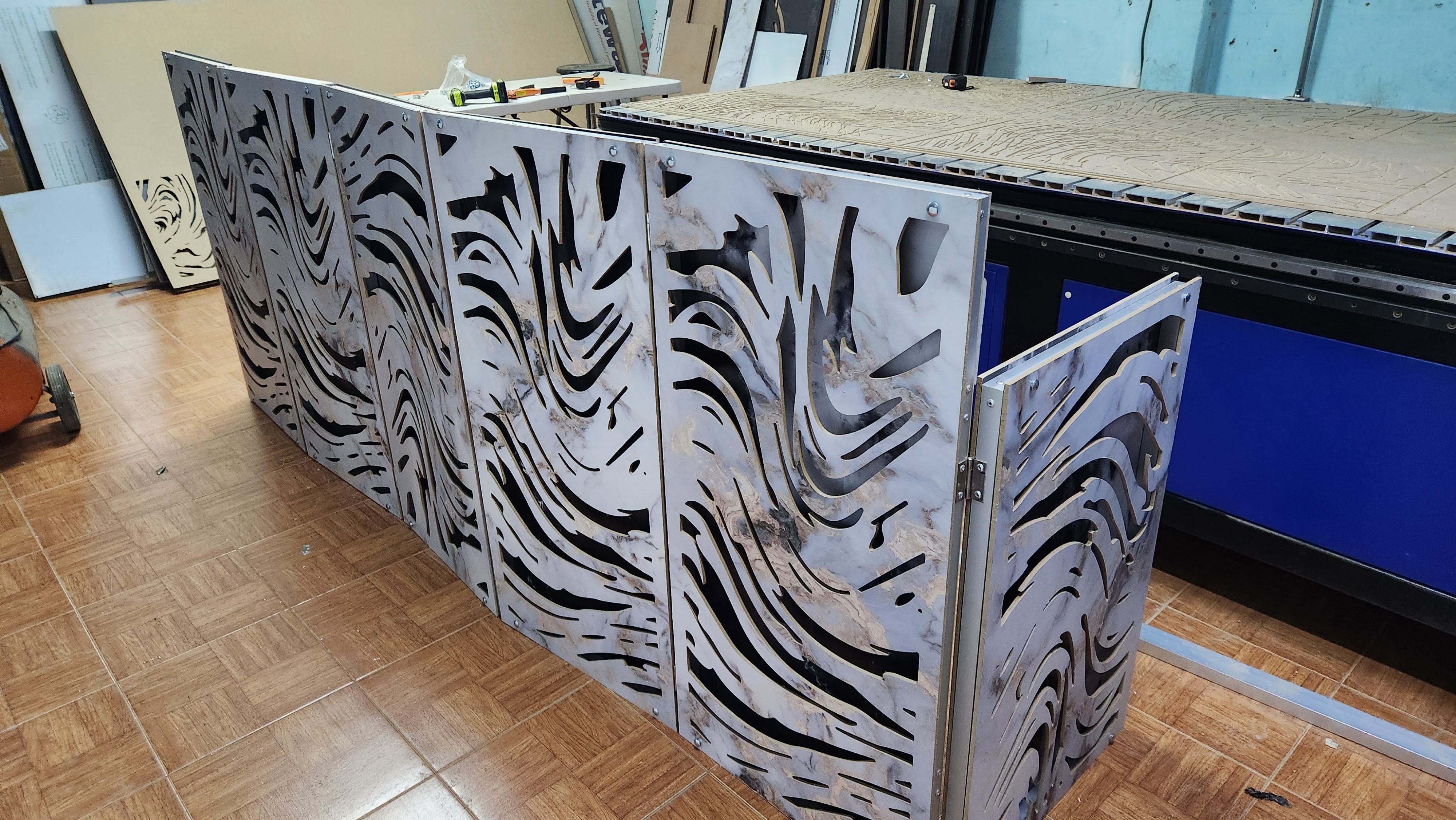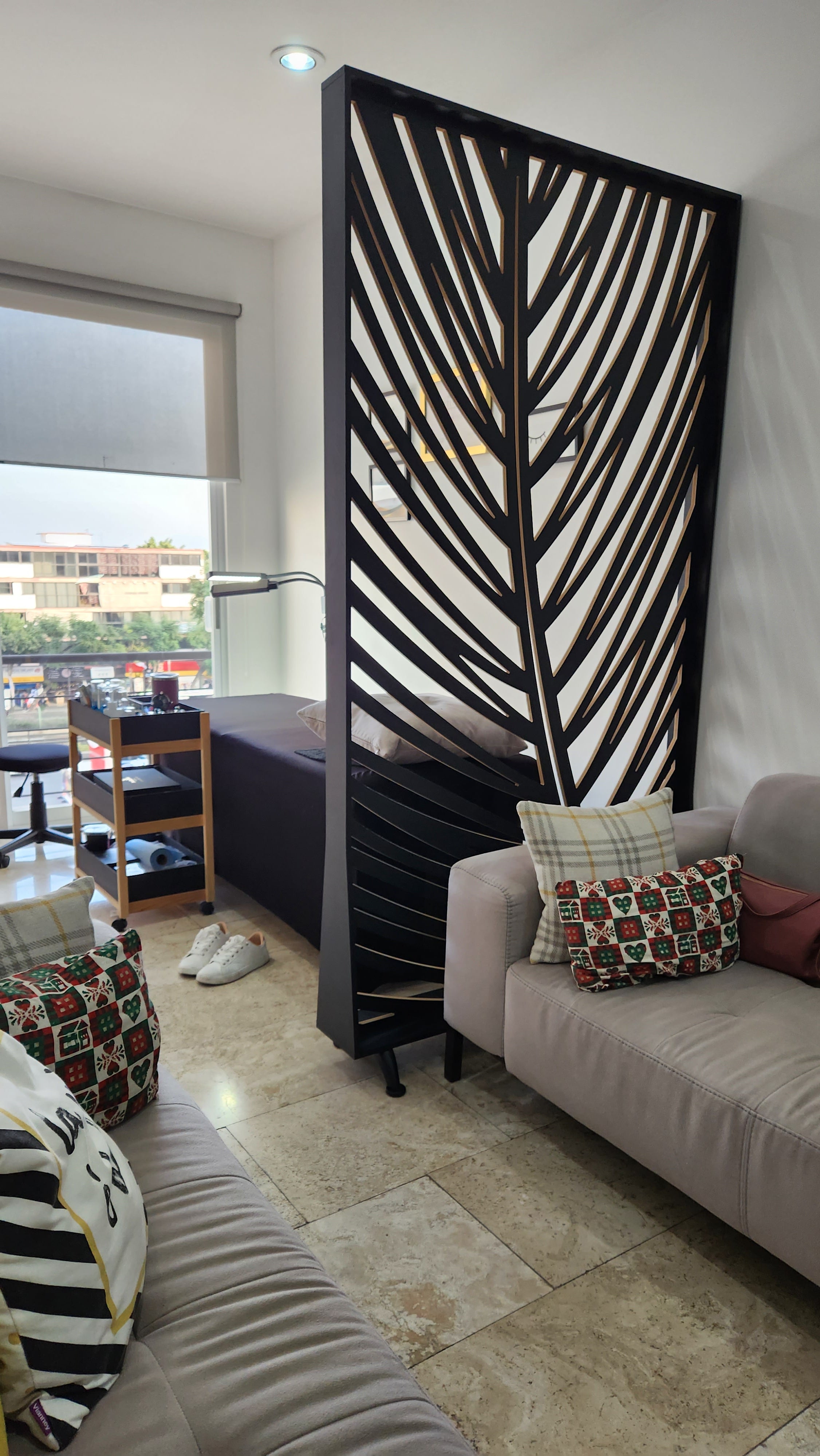 Fabricado con celosías de Mdf de 6 mm recubiertas con vinil de tapiz. Estructura fabricada con perfiles de aluminio.