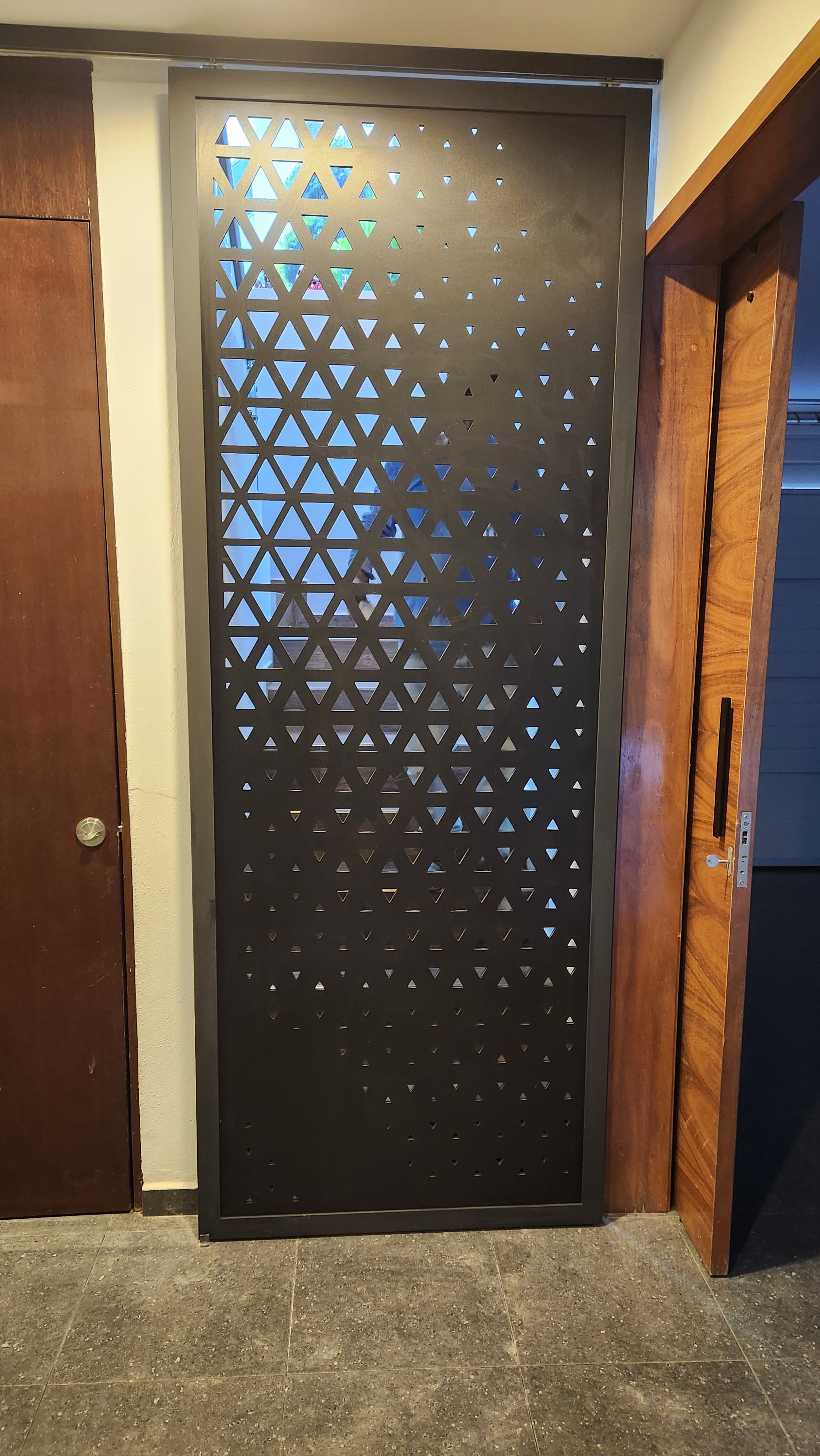 Celosía fabricada en Pvc espumado de 10 mm color negro, con marco de aluminio. Instalada con sistema corredizo Ducasse.