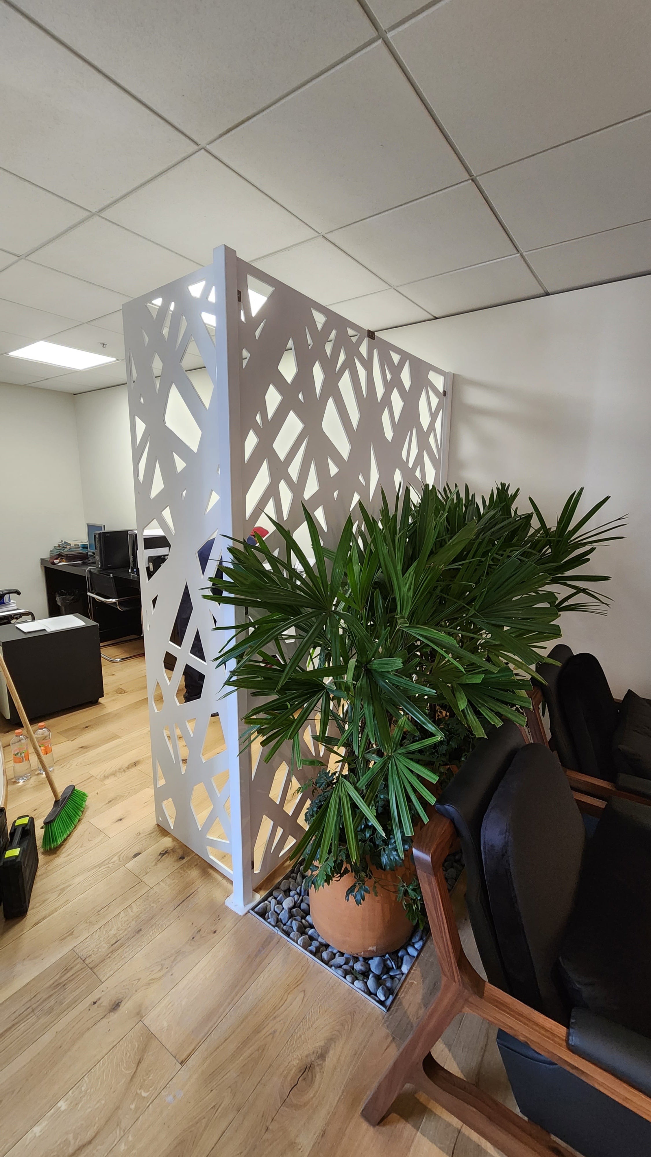 Celosías fabricadas en Pvc espumado de 6 mm, color blanco. Instaladas con cinta doble cara de alta resistencia.