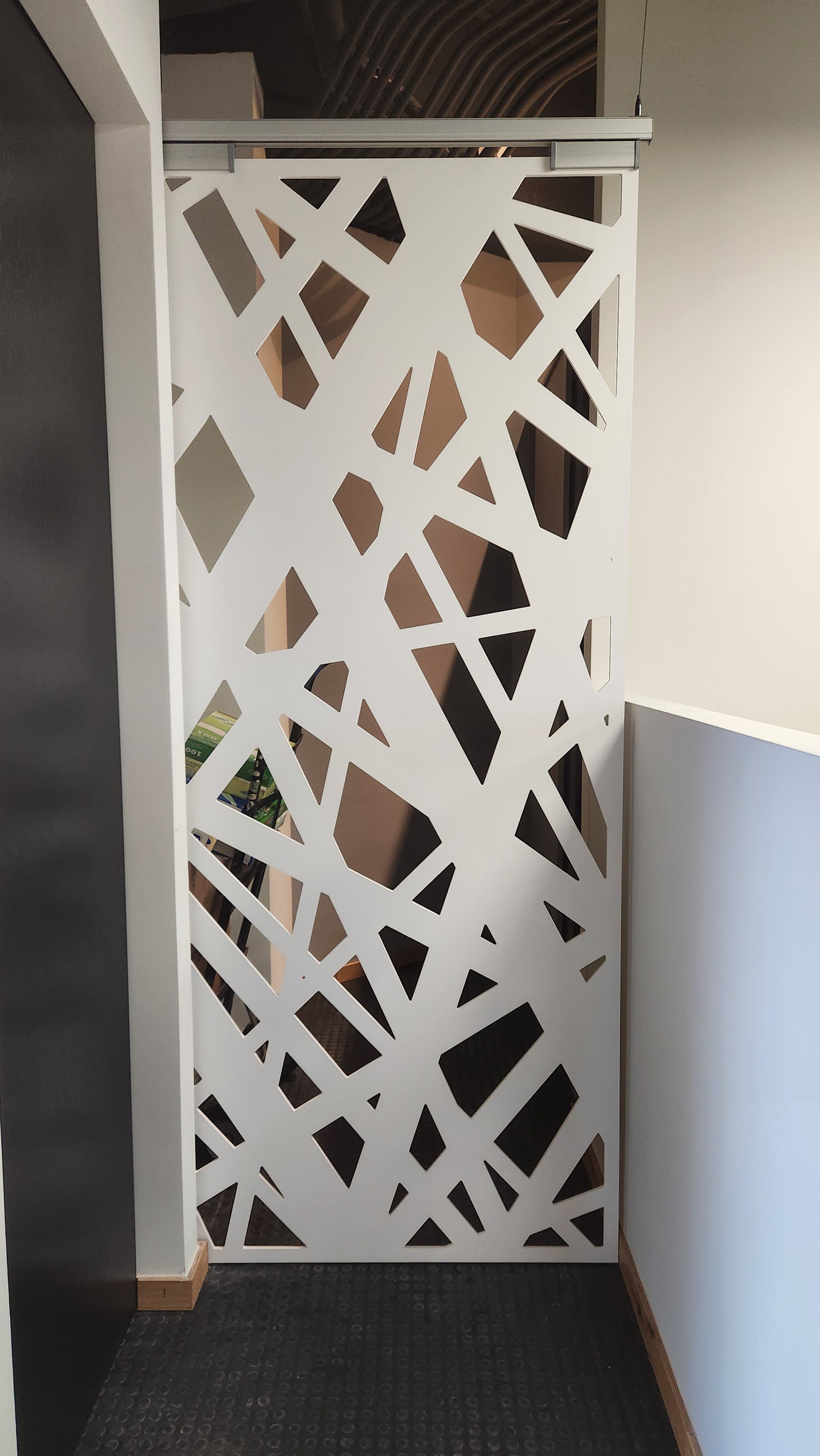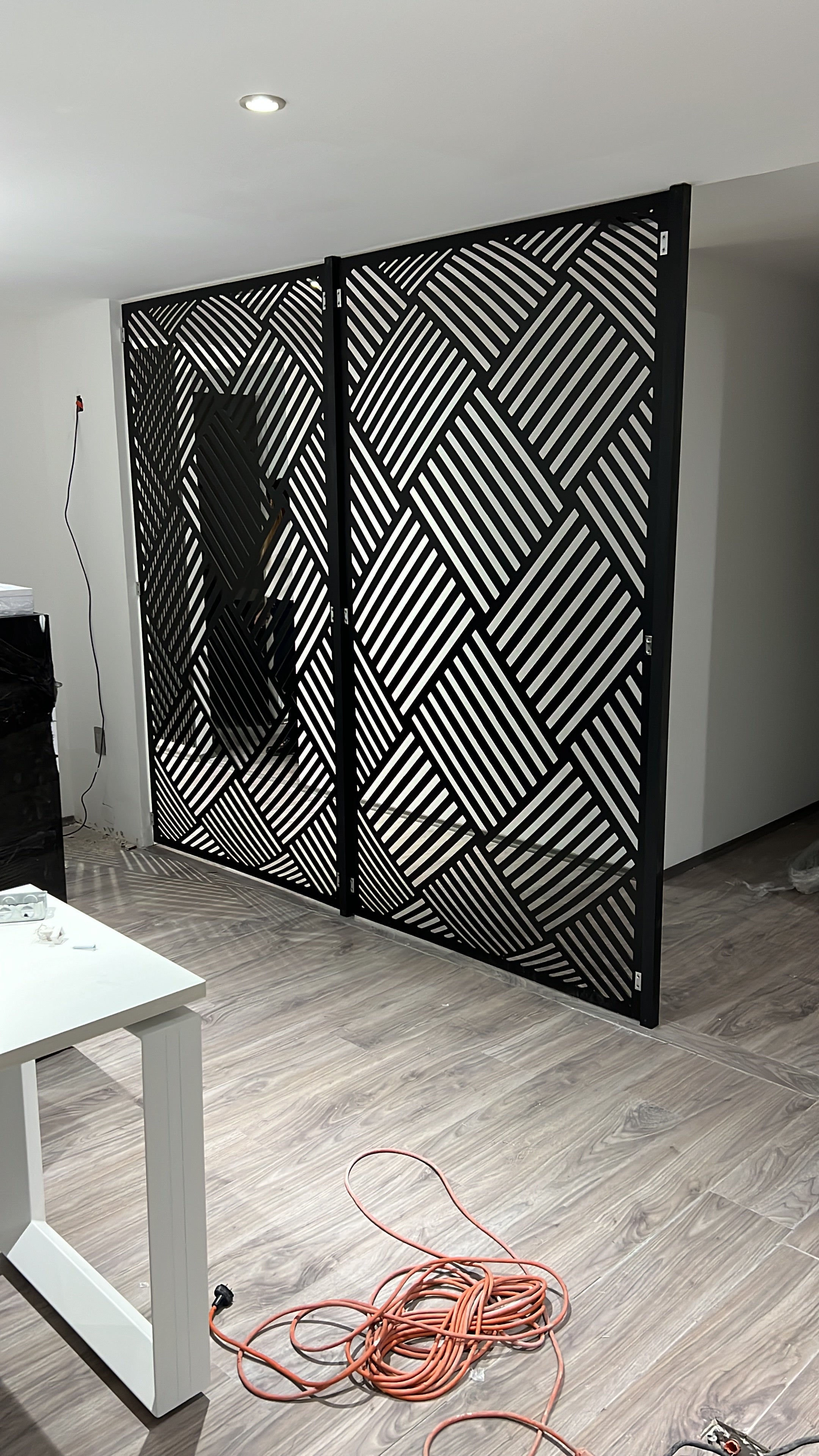 Celosía fabricada en MDF de 9 mm con tratamiento de pintura automotiva color blanco. Instalada con sistema corredizo ducasse y pernos tensores de acero inoxidable.