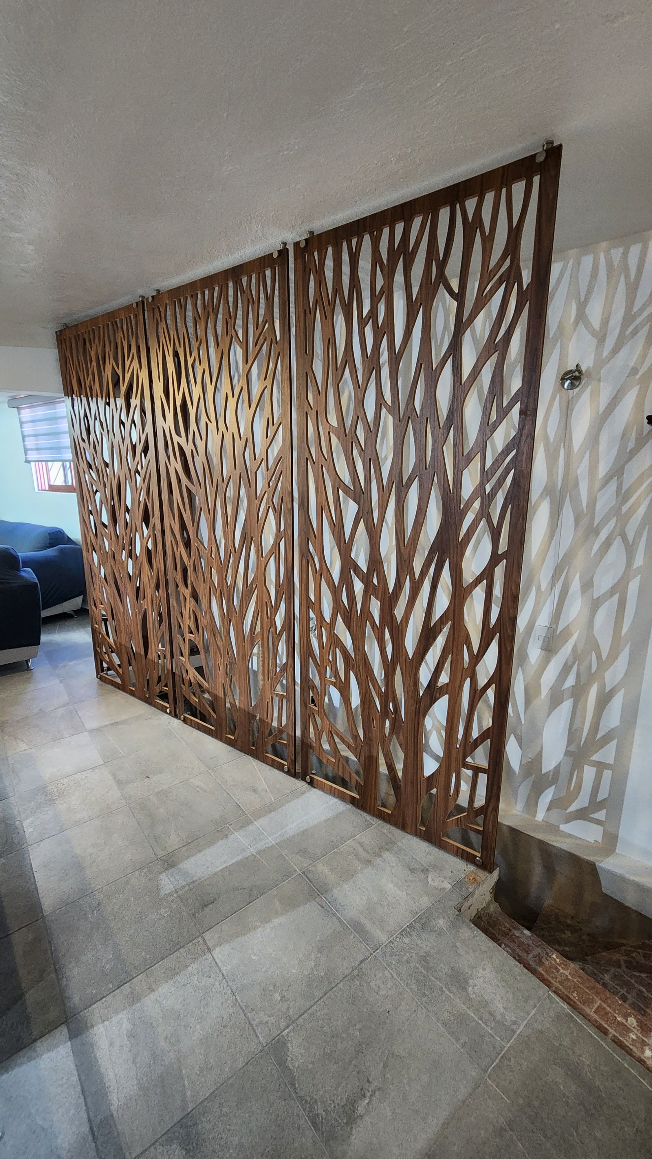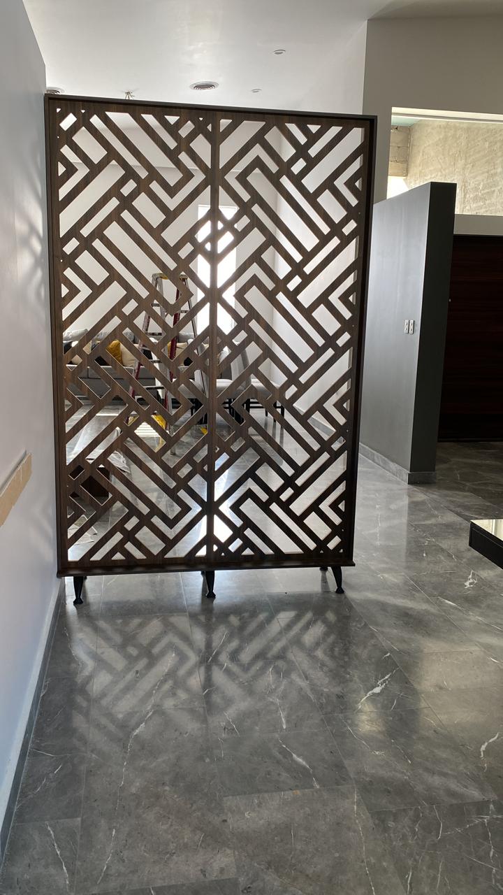 Celosías fabricadas en Mdf de 12 mm con tratamiento de pintura automotiva color nogal americano.