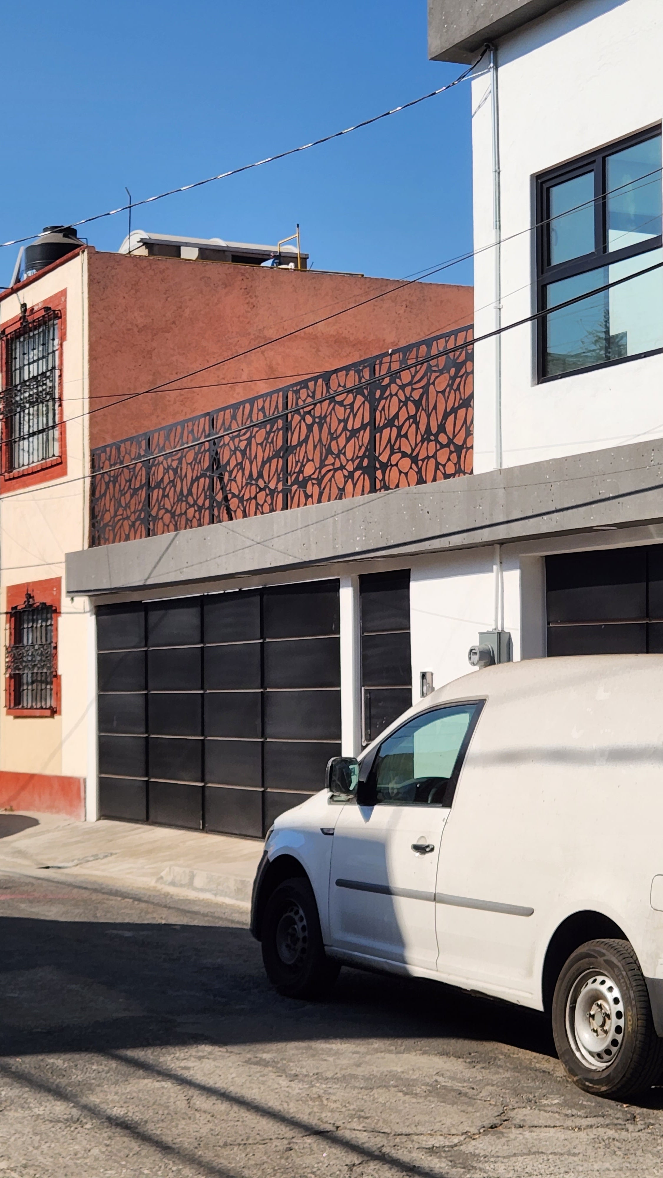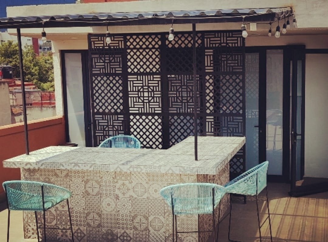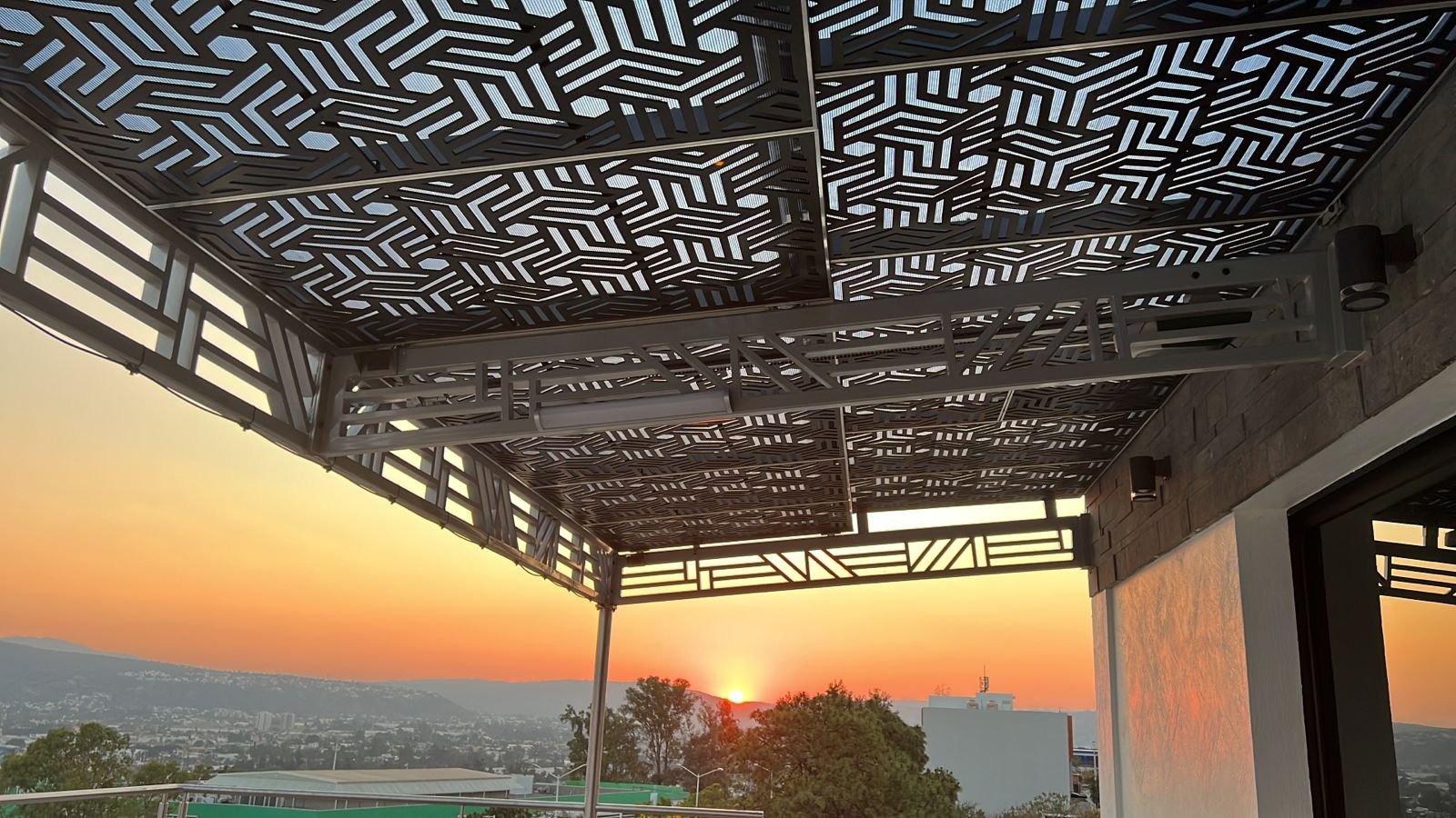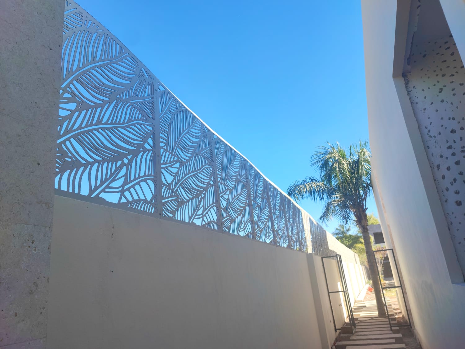 Celosías fabricadas en MDF de 9 mm con tratamiento de pintura automotiva color blanco. Instaladas con postes de PTR y herrajes de acero inoxidable.