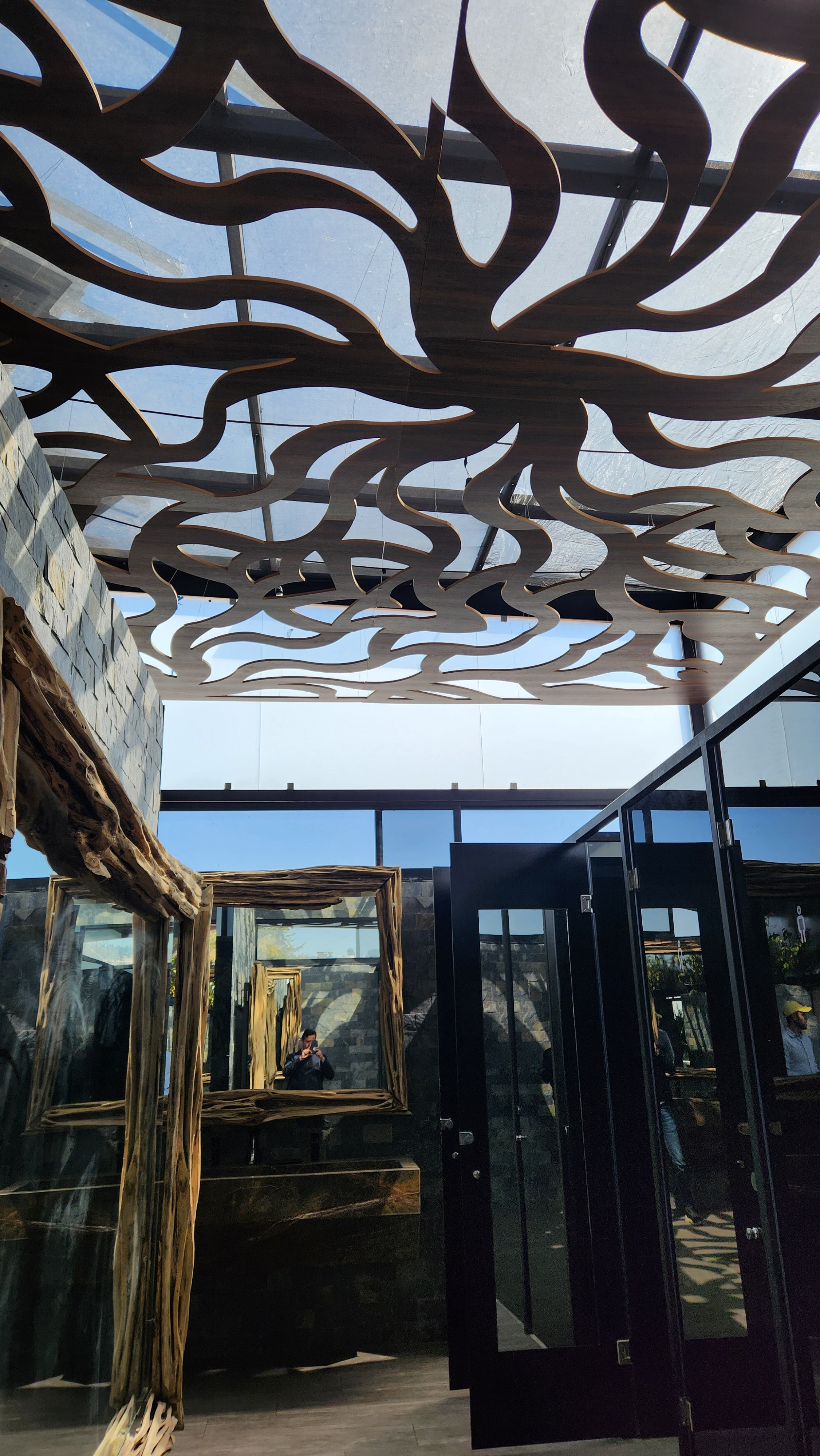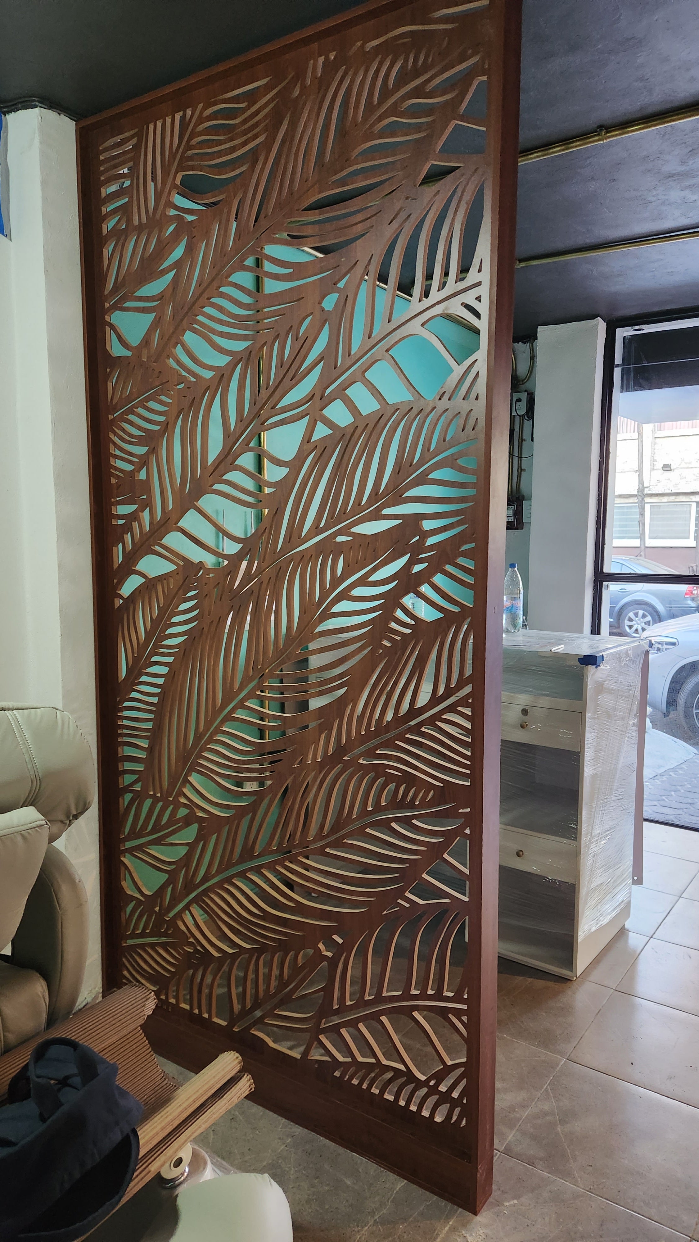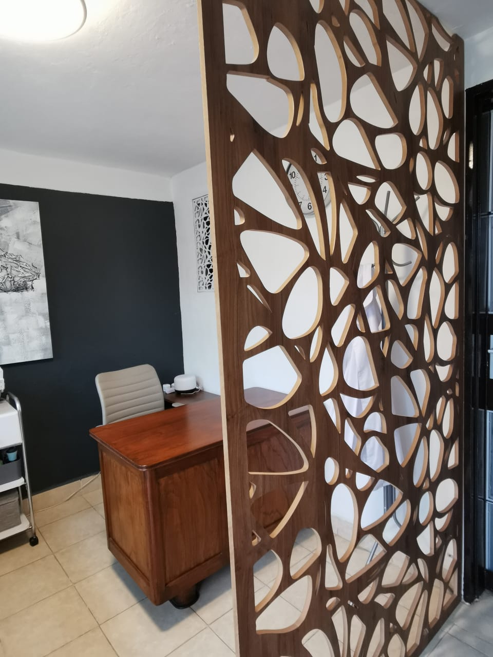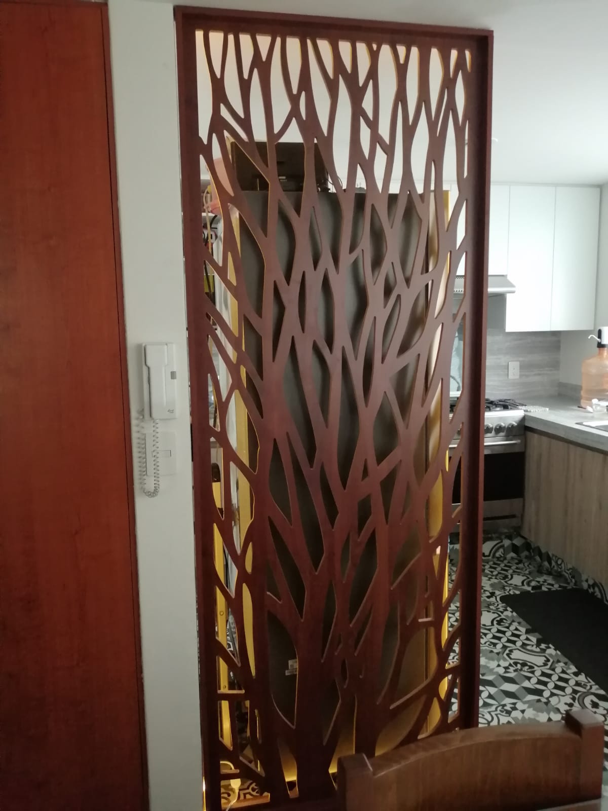 Celosía fabricada en melamina Nogal Pakán de 15 mm. Instalada con ángulos de acero inoxidable.