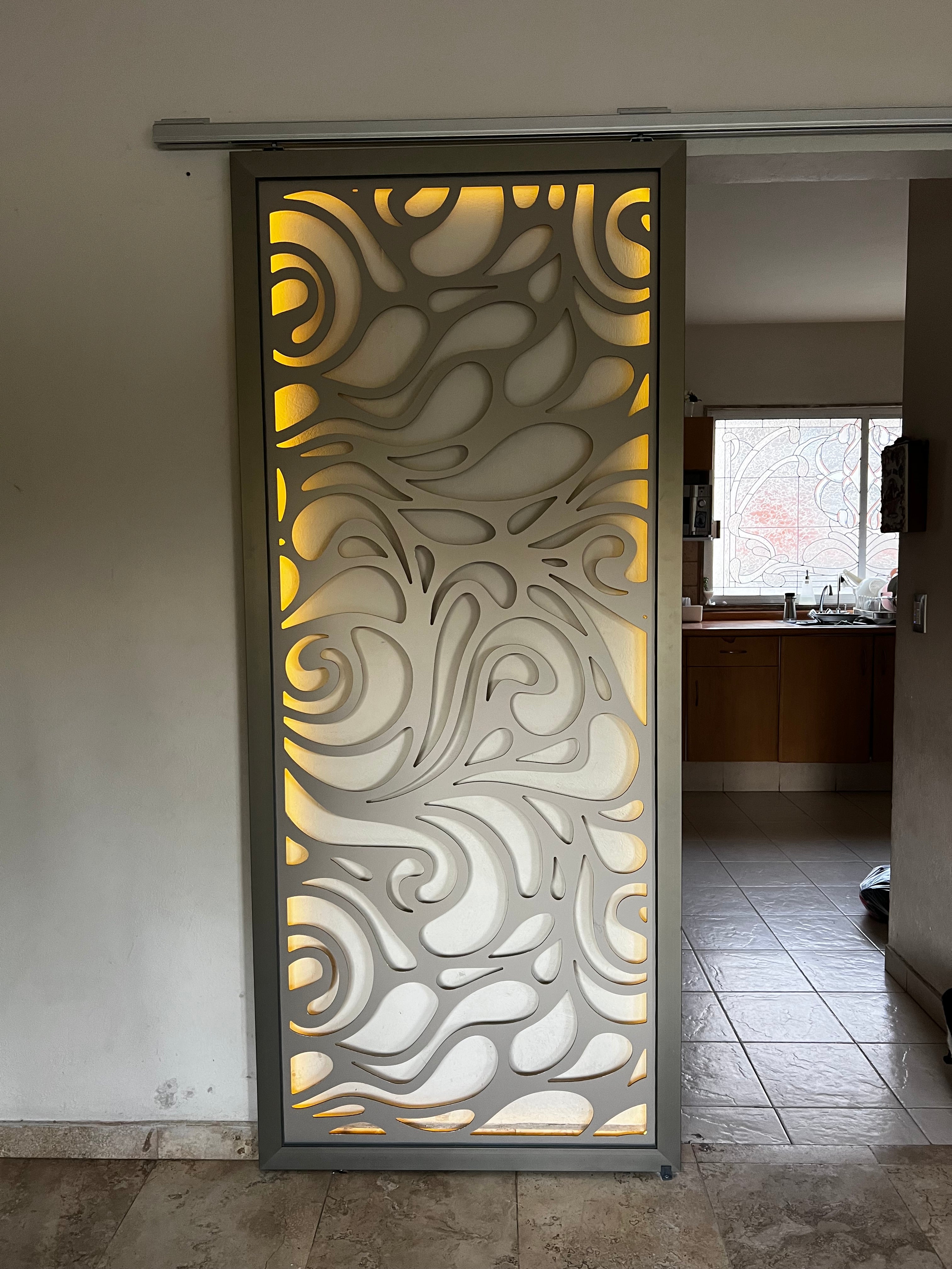 Celosía fabricada en aluminio compuesto de 4 mm color champagne, con marco de aluminio e iluminación. Instalada con sistema corredizo Ducasse.
